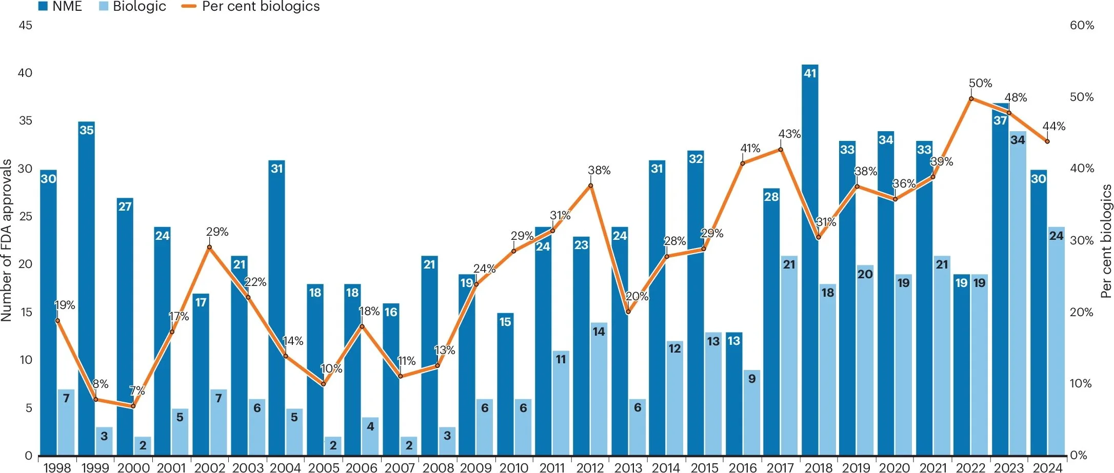 (Melanie Senior, Nature Biotechnology) Almost two-thirds of the 54 new therapies and vaccines indeed emerged from biotech, rather than Big Pharma, pipelines, marking a shift from 2023 and highlighting biotechs’ commercial ambitions. Rare disease drugs made up over half of all new medicines, as has become typical. But there were notable new solutions for widespread chronic conditions, including metabolic dysfunction–associated steatohepatitis (MASH, formerly known as nonalcoholic steatohepatitis (NASH)), schizophrenia, Alzheimer’s disease, chronic obstructive pulmonary disease (COPD) and hypertension. Four anti-infectives were approved. Sufferers of moderate to severe eczema got a new injectable treatment, and a third option arrived for the estimated 6.7 million Americans with autoimmune-linked hair loss.