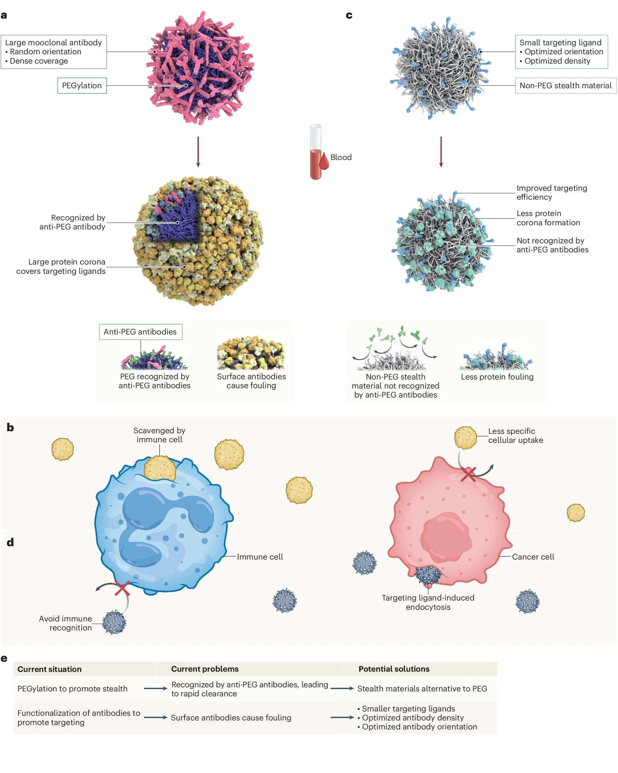 In their Comment, Ju and Kent examine the balance between PEG-induced stealth properties and targeting efficiency. PEG coating reduces nonspecific protein binding and accelerated blood clearance, enhancing the stability of nanoparticles in the bloodstream. At the same time, functionalizing PEGylated nanoparticles with antibodies increases targeting efficiently, but it can compromise stealth. An optimal balance may be achieved by fine-tuning the PEG:antibody ratio, PEG chain length and molecular weight, ligand orientation, and ligand size. Alternatively, engineering an ad hoc artificial protein corona or a better understanding of naturally formed ones could drive organ-specific targeting.