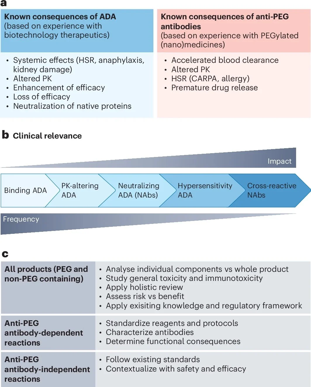 In a second Comment, Dobrovolskaia also discusses the issue of potential immunogenicity of the PEG alternatives and raises additional points. There are two major gaps in knowledge that need to be addressed before considering alternatives. One is the lack of a standardized methodology, control, and reagents for the detection of binding antibodies. The term ‘immunogenicity’ is often misused in the literature to refer to cytokine production, which, while easier to measure, does not necessarily correlate with antigen-specific cellular or humoral response. There is therefore the need to clearly evaluate whether a product is immunogenic (that is, generates antibodies) or immunostimulant (that is, leads to cytokine release without antibody production). The second gap is the need for a deeper understanding of the mechanisms leading to PEG immunogenicity. This includes analysing the nature of the generated antibodies, as not all antibodies are functionally equivalent, with different subclasses and isotypes displaying various degrees of immunotoxicity. Additionally, whether PEG is free, or conjugated to a protein or to a nanoparticle can affect antibody generation.